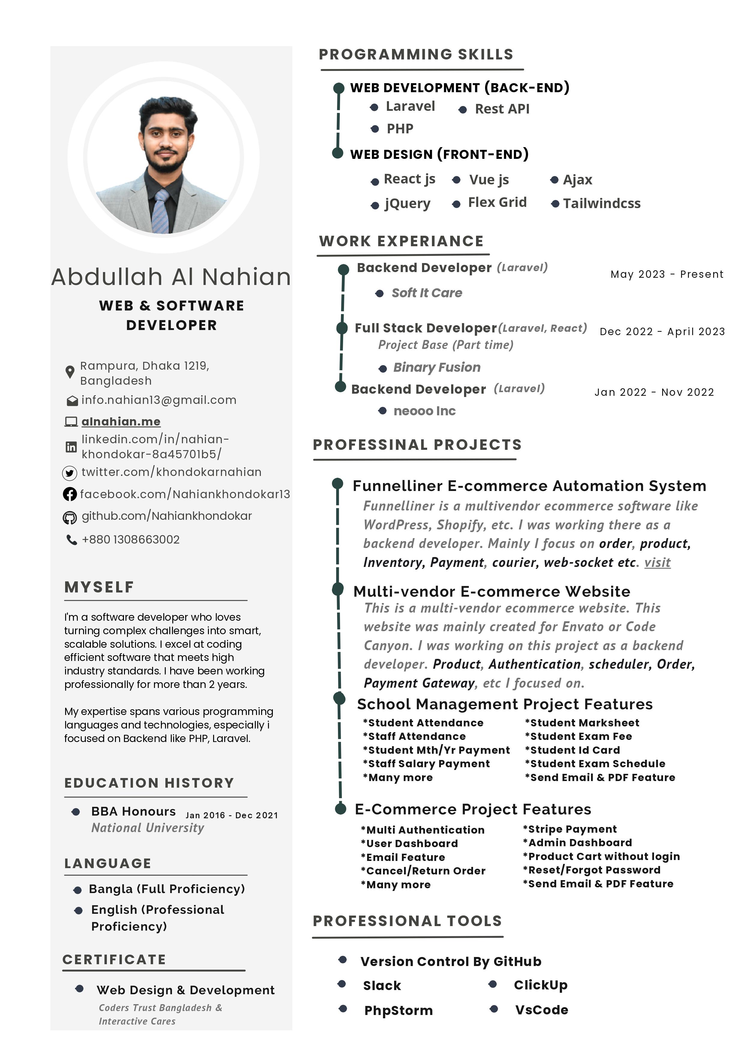 Hi! My name is Nahian. I am Web Designer & Web Developer. I'm very passionate and dedicated to my work. I've been working on Laravel for three years now. I am highly motivated to work on different & challenging projects. I have acquired the skills and knowledge necessary to make your project a success.